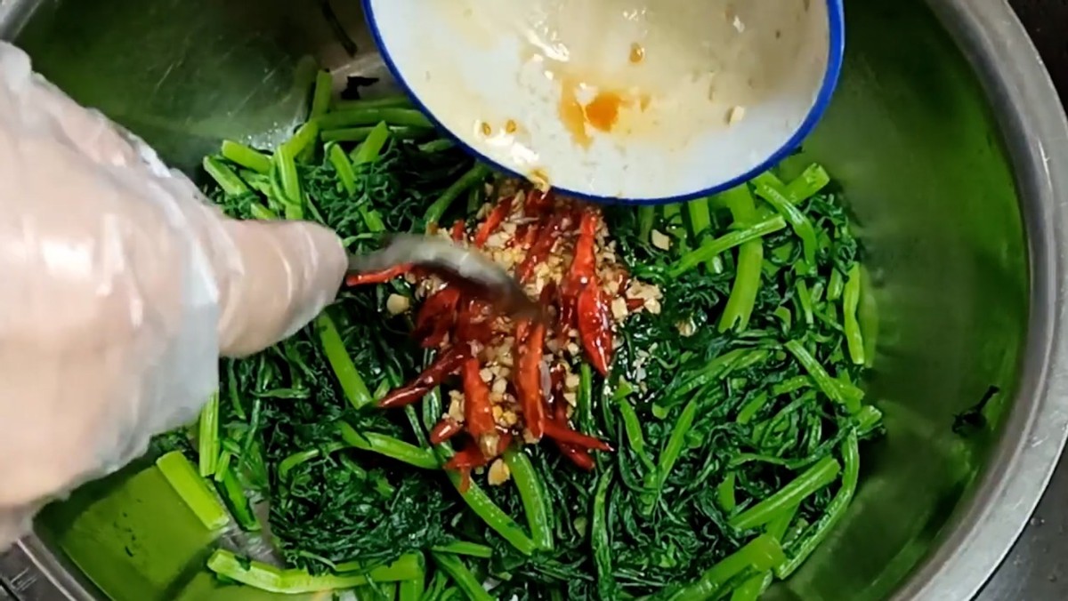 把茼蒿拿出来,把水用力挤干,放在大碗在,把茼蒿抖散开,把调好的料汁加进来,用手搅拌均匀,搅均后装盘。