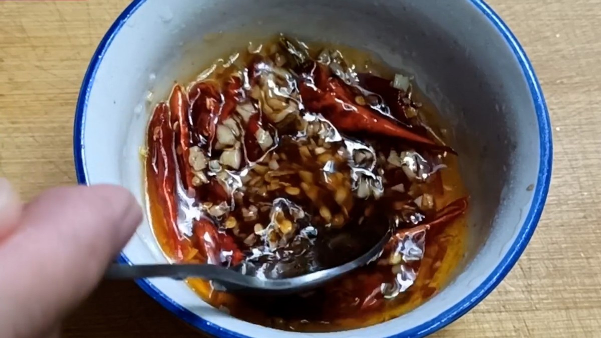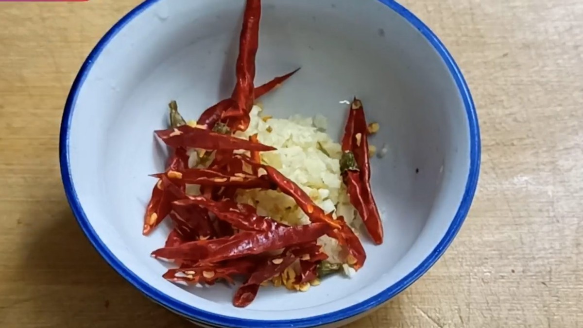 大蒜切碎再剁成蒜末,干辣椒切成细丝,切好放碗中,加入滚烫的热油,激发出香味。
