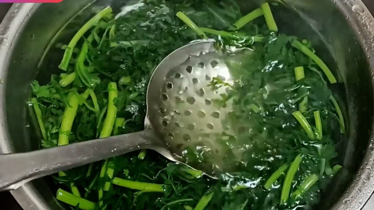 水烧开,放一勺盐,一勺猪油,先把茼蒿根放里面焯烫30秒,然后把叶子放里边再煮烫一分钟左右,时间到控水捞出来,迅速放入凉开水中过凉。
