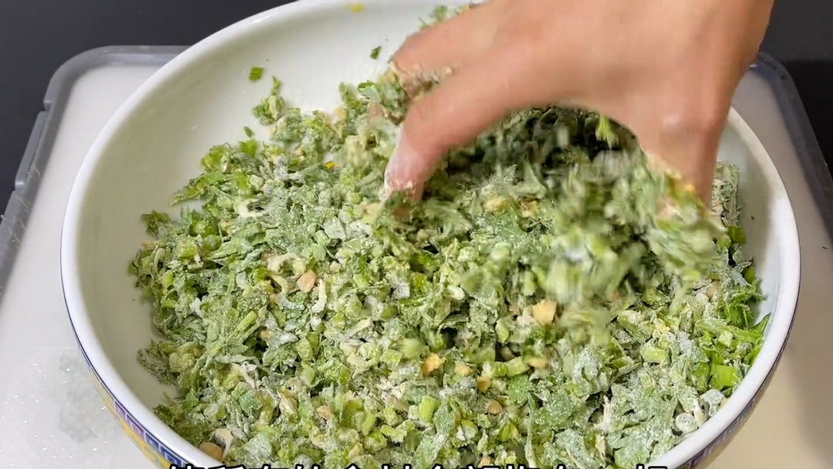水分控干放在案板上切碎,切好放到大盆中,放入一点芝麻香油,锁住水分,搅拌均匀,放一些虾皮。