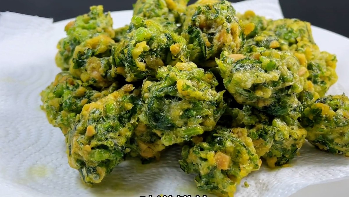 炸制丸子金黄酥脆,即可捞出控油捞出,放在盘中,再撒上椒盐,辣椒面,一道茼蒿蔬菜丸子就做好了。