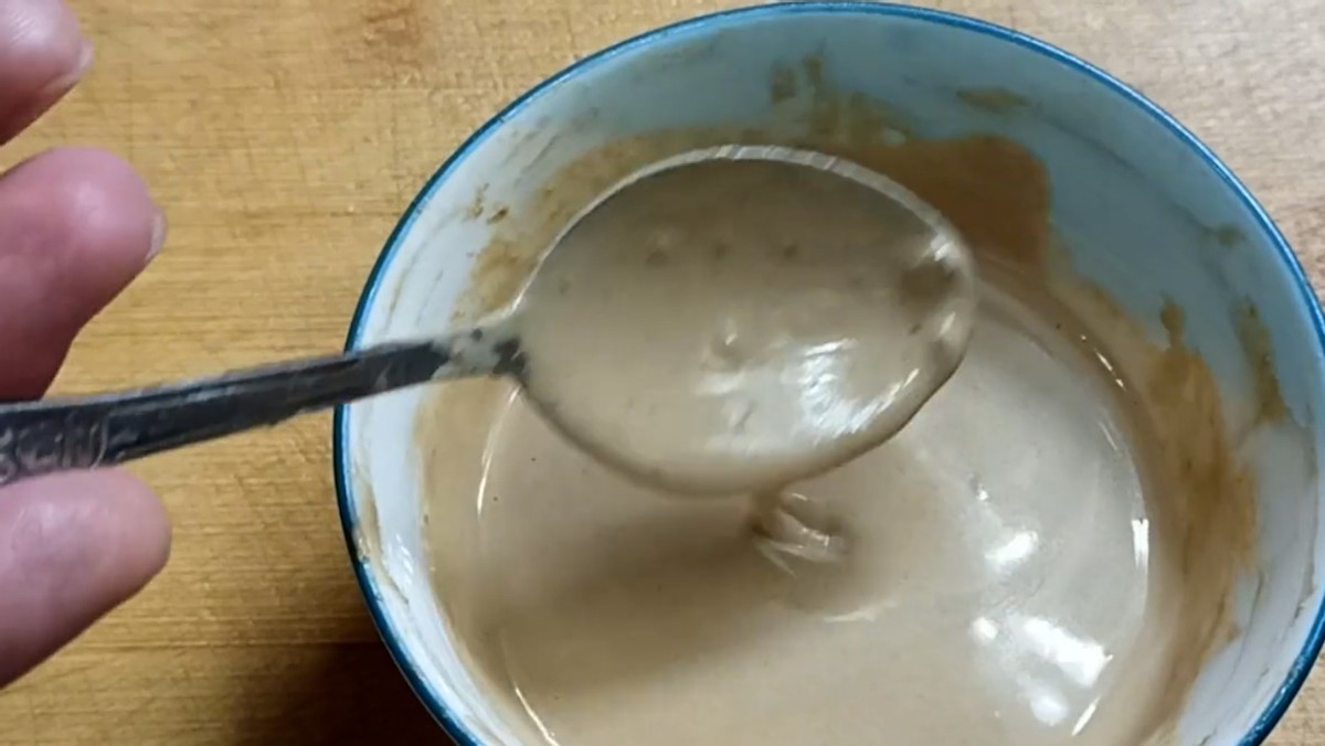 小碗放入一勺芝麻酱,加入一勺盐,倒入热水,把芝麻酱搅拌卸开,芝麻酱卸开后成浓稠的浆糊状。