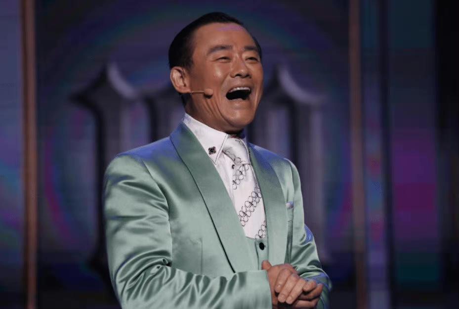 不知道是不是为了找回以往站在舞台上的感觉,这次表演周立波还是选择了一身看起来十分体面的西装,并梳上了油头。内搭的高领黑色毛衣,脖子上还挂着一条金链子,再加上身材过于壮硕把西装撑得满满的,整个人的气质都有些油腻。