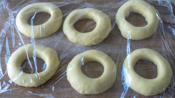3、油温6成热下甜甜圈,用中火炸,注意翻面