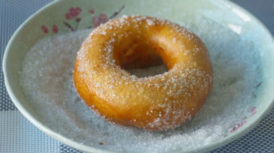 7、炸至两面金黄就可以出锅了,趁热裹上白糖,香甜又柔软的油炸甜甜圈就做好了;