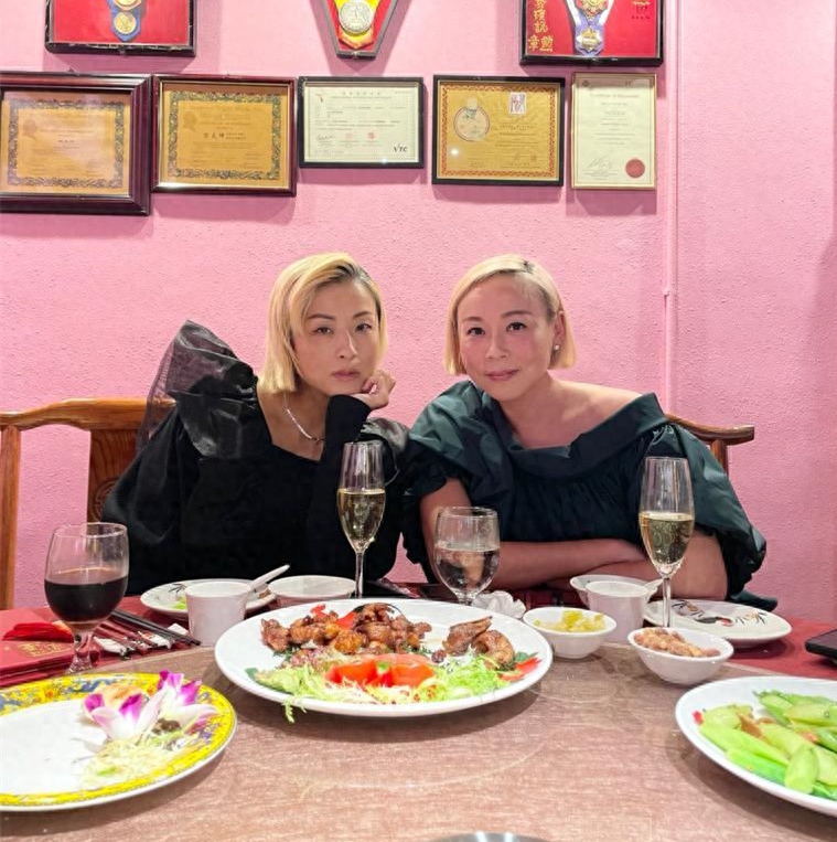 其中,穿着深色衣服,一头短发染成金色的徐濠萦,跟苏永康妻子的打扮太相似了,乍一看像一对姐妹一样。