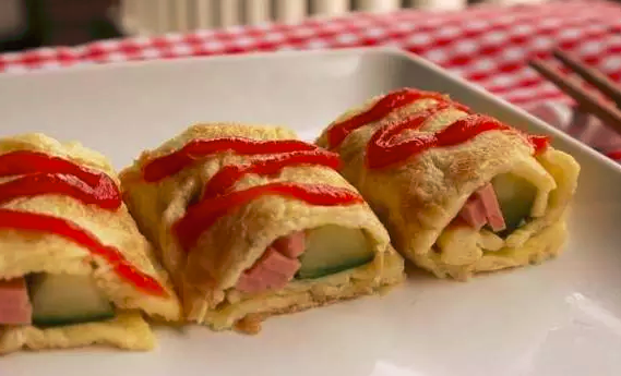 1.黄瓜削成长条,鸡蛋摊成蛋饼,火腿肠切段。