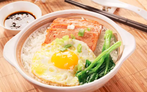 大米,清水(大米量的1倍),火腿(2根),油菜(1颗),鸡蛋(1个),土豆(一个),色拉油,老抽(半勺),生抽(1勺),耗油(1勺),白糖(半勺),香油(几滴)。