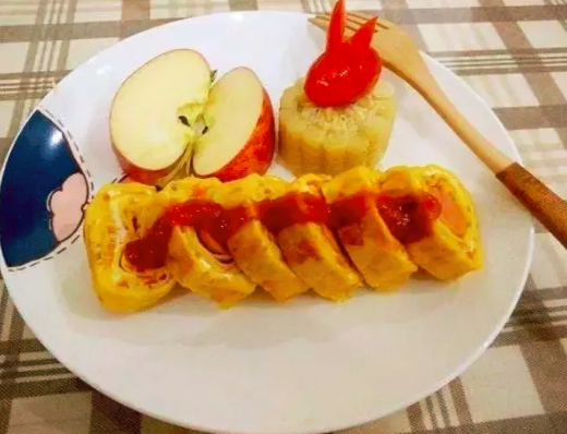 3.鸡蛋凝固后,撒上香葱、番茄、火腿丁,小心卷起。