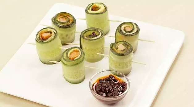 3.火腿肠蘸上辣椒酱用黄瓜条卷起。