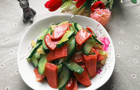 黄瓜300g、火腿150g。姜3g、盐5g、味精3g。