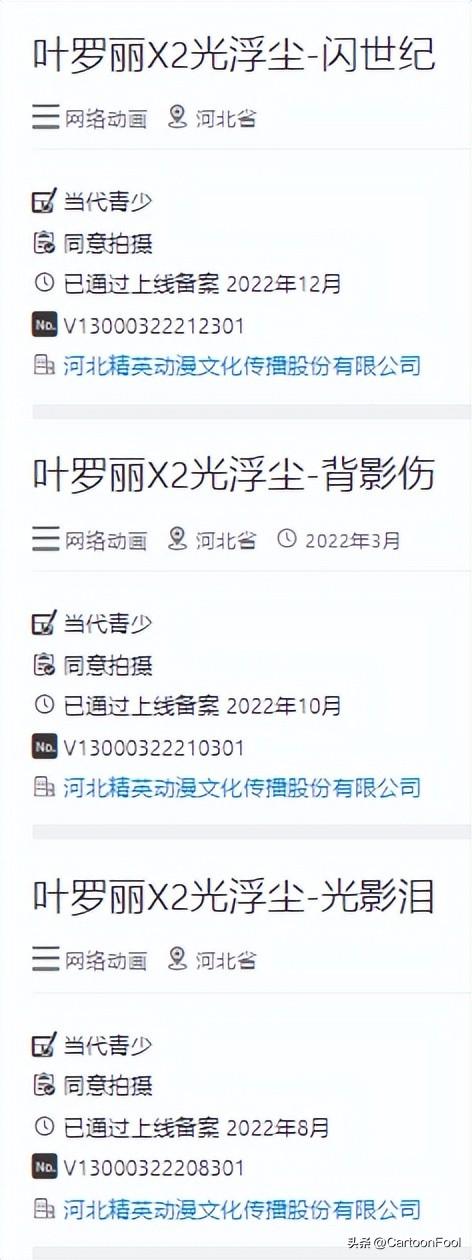《叶罗丽X2光浮尘》的三个篇章《叶罗丽X2光浮尘-闪世纪》《叶罗丽X2光浮尘-背影伤》《叶罗丽X2光浮尘-光影泪》分别在8月,10月,12月通过了上线备案,这也就意味着12月的任何一天《叶罗丽X2光浮尘》都可以定档了。