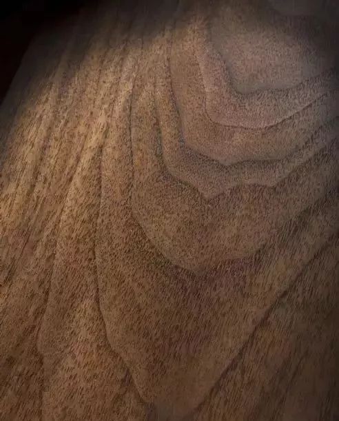 黑胡桃木纹理别致,不仅是弦切面有美丽的大抛物线花纹(大山纹),还有其他树木所不具有的曲线,如波浪、涡卷、瘿木、小指甲大小的“鸟啄痕”针结等,偶尔会出现罕见的高贵祥瑞的紫色及条纹——紫气东来,因而更加名贵。