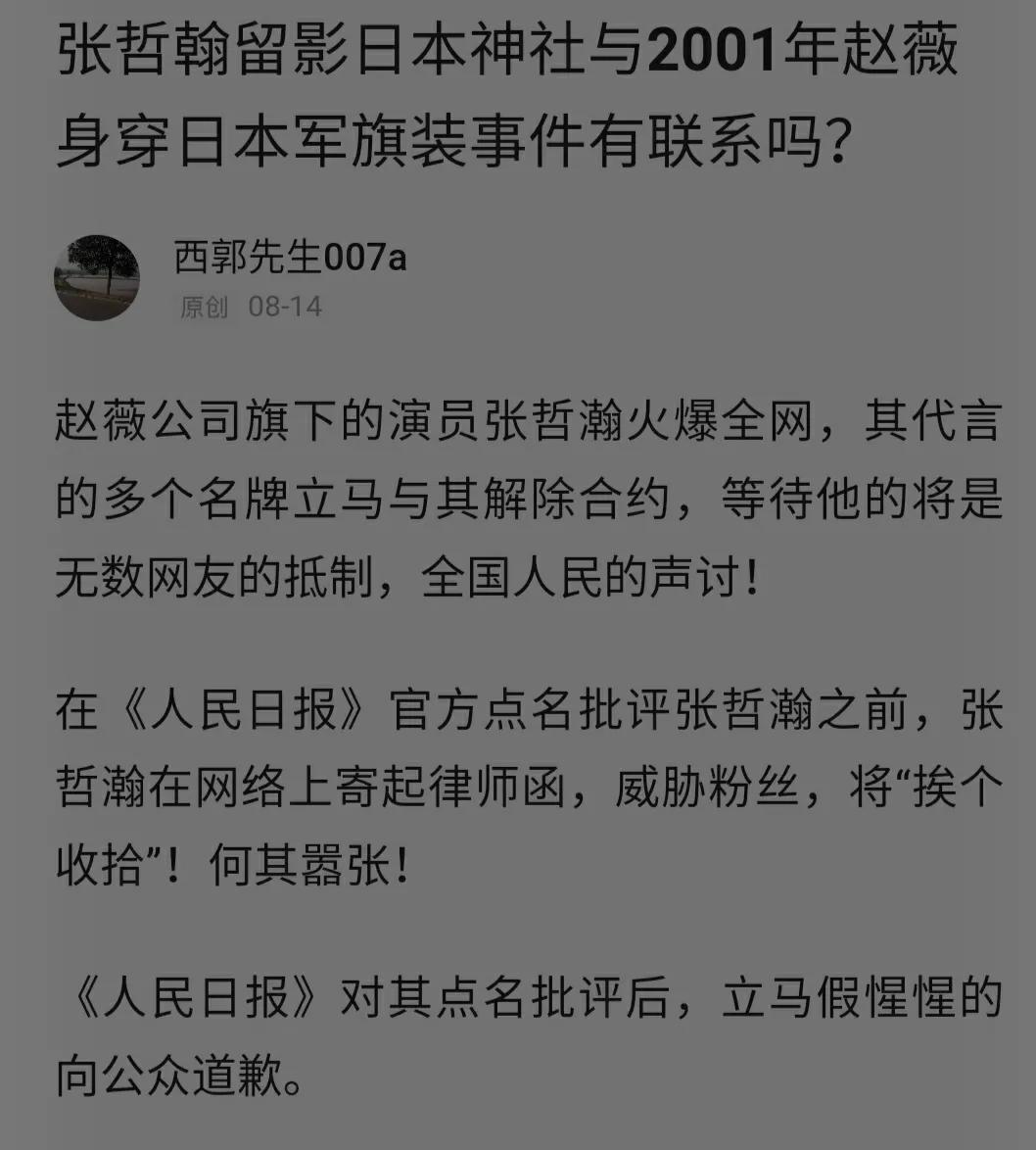 最近其公司麾下又爆出,张哲翰宣扬日本军国主义旭日旗和参观日本神社的事件。