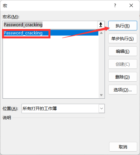 3.之后关闭这个vb界面,打开“查看宏”,会出现“Password_cracking”,点击执行便开始破解