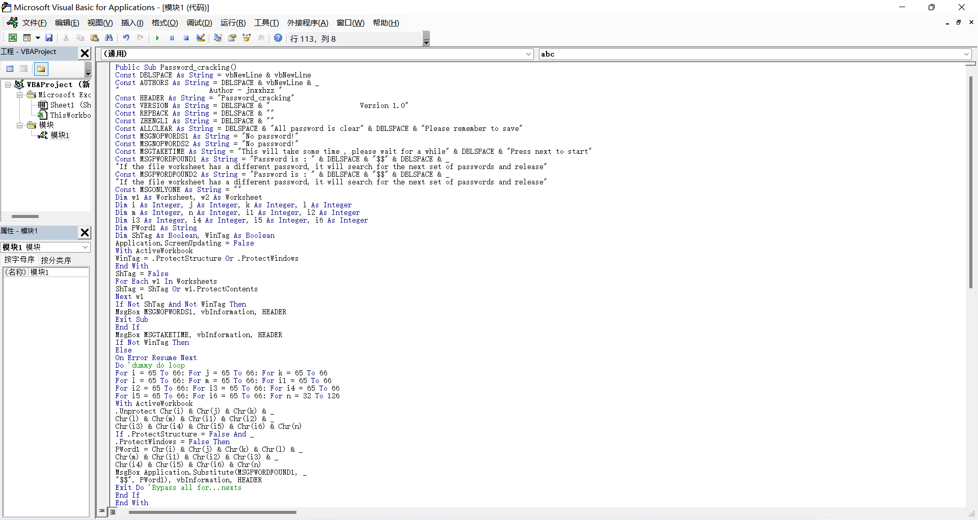 PublicSub Password_cracking()ConstDBLSPACE As String = vbNewLine & vbNewLineConstAUTHORS As String = DBLSPACE & vbNewLine & _"Author - jnxxhzz "ConstHEADER As String = "Password_cracking"ConstVERSION As String = DBLSPACE & " Version 1.0"ConstREPBACK As String = DBLSPACE & ""ConstZHENGLI As String = DBLSPACE & ""ConstALLCLEAR As String = DBLSPACE & "All password is clear" & DBLSPACE & "Please remember to save"ConstMSGNOPWORDS1 As String = "No password!"ConstMSGNOPWORDS2 As String = "No password!"ConstMSGTAKETIME As String = "This will take some time , please wait for a while" & DBLSPACE & "Press next to start"ConstMSGPWORDFOUND1 As String = "Password is : " & DBLSPACE & "$$" & DBLSPACE & _"Ifthe file worksheet has a different password, it will search for the next set of passwords and release"ConstMSGPWORDFOUND2 As String = "Password is : " & DBLSPACE & "$$" & DBLSPACE & _"Ifthe file worksheet has a different password, it will search for the next set of passwords and release"ConstMSGONLYONE As String = ""Dimw1 As Worksheet, w2 As WorksheetDimi As Integer, j As Integer, k As Integer, l As IntegerDimm As Integer, n As Integer, i1 As Integer, i2 As IntegerDimi3 As Integer, i4 As Integer, i5 As Integer, i6 As IntegerDimPWord1 As StringDimShTag As Boolean, WinTag As BooleanApplication.ScreenUpdating=FalseWithActiveWorkbookWinTag=.ProtectStructure Or .ProtectWindowsEndWithShTag=FalseForEach w1 In WorksheetsShTag=ShTag Or w1.ProtectContentsNextw1IfNot ShTag And Not WinTag ThenMsgBoxMSGNOPWORDS1, vbInformation, HEADERExitSubEndIfMsgBoxMSGTAKETIME, vbInformation, HEADERIfNot WinTag ThenElseOnError Resume NextDo'dummy do loopFori = 65 To 66: For j = 65 To 66: For k = 65 To 66Forl = 65 To 66: For m = 65 To 66: For i1 = 65 To 66Fori2 = 65 To 66: For i3 = 65 To 66: For i4 = 65 To 66Fori5 = 65 To 66: For i6 = 65 To 66: For n = 32 To 126WithActiveWorkbook.UnprotectChr(i) & Chr(j) & Chr(k) & _Chr(l)& Chr(m) & Chr(i1) & Chr(i2) & _Chr(i3)& Chr(i4) & Chr(i5) & Chr(i6) & Chr(n)If.ProtectStructure = False And _.ProtectWindows=False ThenPWord1=Chr(i) & Chr(j) & Chr(k) & Chr(l) & _Chr(m)& Chr(i1) & Chr(i2) & Chr(i3) & _Chr(i4)& Chr(i5) & Chr(i6) & Chr(n)MsgBoxApplication.Substitute(MSGPWORDFOUND1, _"$$",PWord1), vbInformation, HEADERExitDo 'Bypass all for...nextsEndIfEndWithNext:Next: Next: Next: Next: NextNext:Next: Next: Next: Next: NextLoopUntil TrueOnError GoTo 0EndIfIfWinTag And Not ShTag ThenMsgBoxMSGONLYONE, vbInformation, HEADERExitSubEndIfOnError Resume NextForEach w1 In Worksheets'Attemptclearance with PWord1w1.UnprotectPWord1Nextw1OnError GoTo 0ShTag=FalseForEach w1 In Worksheets'Checksfor all clear ShTag triggered to 1 if not.ShTag=ShTag Or w1.ProtectContentsNextw1IfShTag ThenForEach w1 In WorksheetsWithw1If.ProtectContents ThenOnError Resume NextDo'Dummy do loopFori = 65 To 66: For j = 65 To 66: For k = 65 To 66Forl = 65 To 66: For m = 65 To 66: For i1 = 65 To 66Fori2 = 65 To 66: For i3 = 65 To 66: For i4 = 65 To 66Fori5 = 65 To 66: For i6 = 65 To 66: For n = 32 To 126.UnprotectChr(i) & Chr(j) & Chr(k) & _Chr(l)& Chr(m) & Chr(i1) & Chr(i2) & Chr(i3) & _Chr(i4)& Chr(i5) & Chr(i6) & Chr(n)IfNot .ProtectContents ThenPWord1=Chr(i) & Chr(j) & Chr(k) & Chr(l) & _Chr(m)& Chr(i1) & Chr(i2) & Chr(i3) & _Chr(i4)& Chr(i5) & Chr(i6) & Chr(n)MsgBoxApplication.Substitute(MSGPWORDFOUND2, _"$$",PWord1), vbInformation, HEADER'leveragefinding Pword by trying on other sheetsForEach w2 In Worksheetsw2.UnprotectPWord1Nextw2ExitDo 'Bypass all for...nextsEndIfNext:Next: Next: Next: Next: NextNext:Next: Next: Next: Next: NextLoopUntil TrueOnError GoTo 0EndIfEndWithNextw1EndIfMsgBoxALLCLEAR & AUTHORS & VERSION & REPBACK & ZHENGLI, vbInformation, HEADEREndSub