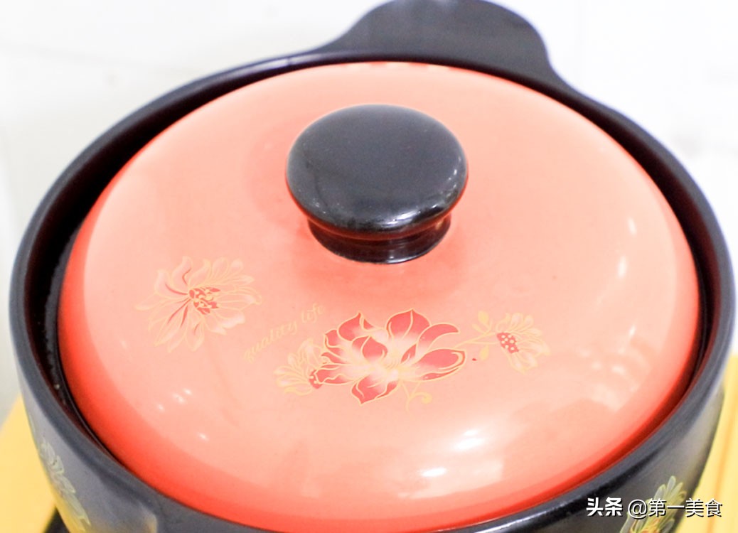 接着,把调好的酱汁淋入砂锅内,盖上砂锅盖继续炖。