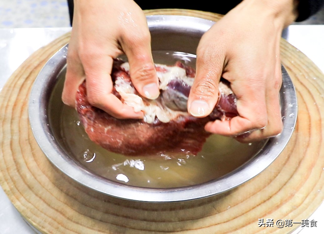 2个小时后挤压出牛肉的血水,清洗干净后捞出备用,浸泡的目的是充分去除牛肉中的血水。