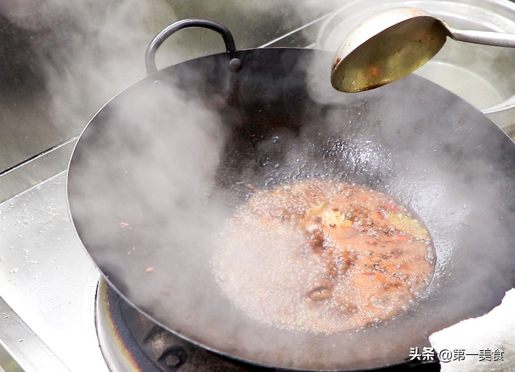锅内烧油,油热后,倒入准备好的姜、辣椒等大料翻炒出香味,温度不要太高,免得把辣椒炒糊。