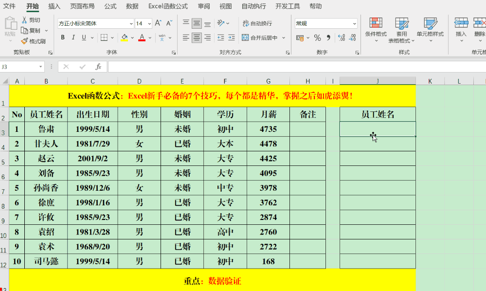 目的:在指定的单元格区域中通过下拉菜单显示“员工姓名”。