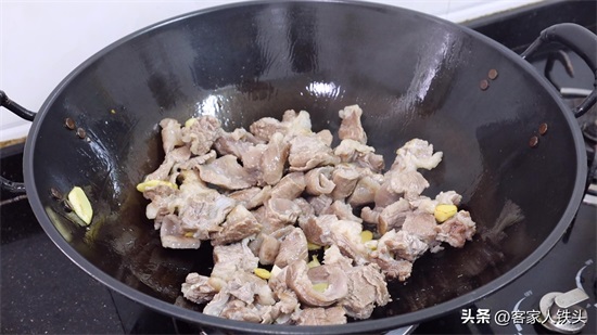 第五步:准备一个大铁锅,把锅烧热后倒点油进去,再倒入姜片,先把姜片爆香,姜片爆至有一点焦褐感时,我们倒入牛腩,把牛腩翻炒一下,炒出牛腩的香味,把表面的水分炒干后,我们先往里面加一点高度白酒,给它去去腥骚味,继续把它翻炒一下。