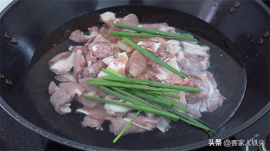 第三步:牛腩切好后焯一下水,冷水下锅,大家记住一定要冷水下锅,再放点葱段进去,洒上点料酒,用大火煮开后再煮上3分钟,随着水温的升高,血水开始往外冒,锅里的水会很浑浊,所以大家一定要冷水下锅,牛腩才能很好的释放出它的血水,烧至水开后,它表面会凝结出大量的浮沫,这时我们用勺子把它打掉,打掉浮沫后再来清洗,也是非常有必要的,要不然它全部粘附在肉的上面就不好清洗了。