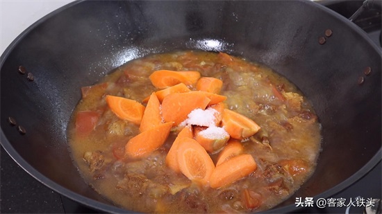 第七步:好了,牛腩焖了有一个小时了,现在把胡萝卜加进去,再加入一小勺的白糖提鲜,调入适量的盐,盐我们要后下哈,不要太早下,把它翻动一下,再次把锅盖盖上,继续焖多25分钟左右就可以了。