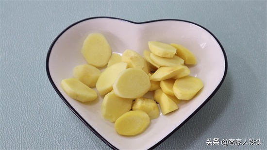 第四步:姜片我们要准备多一点,去掉姜皮,我们广东人做牛腩不喜欢放大料,但姜片会放得比较多,这道菜做好后,姜片都很好吃的,微辣而且很开胃。