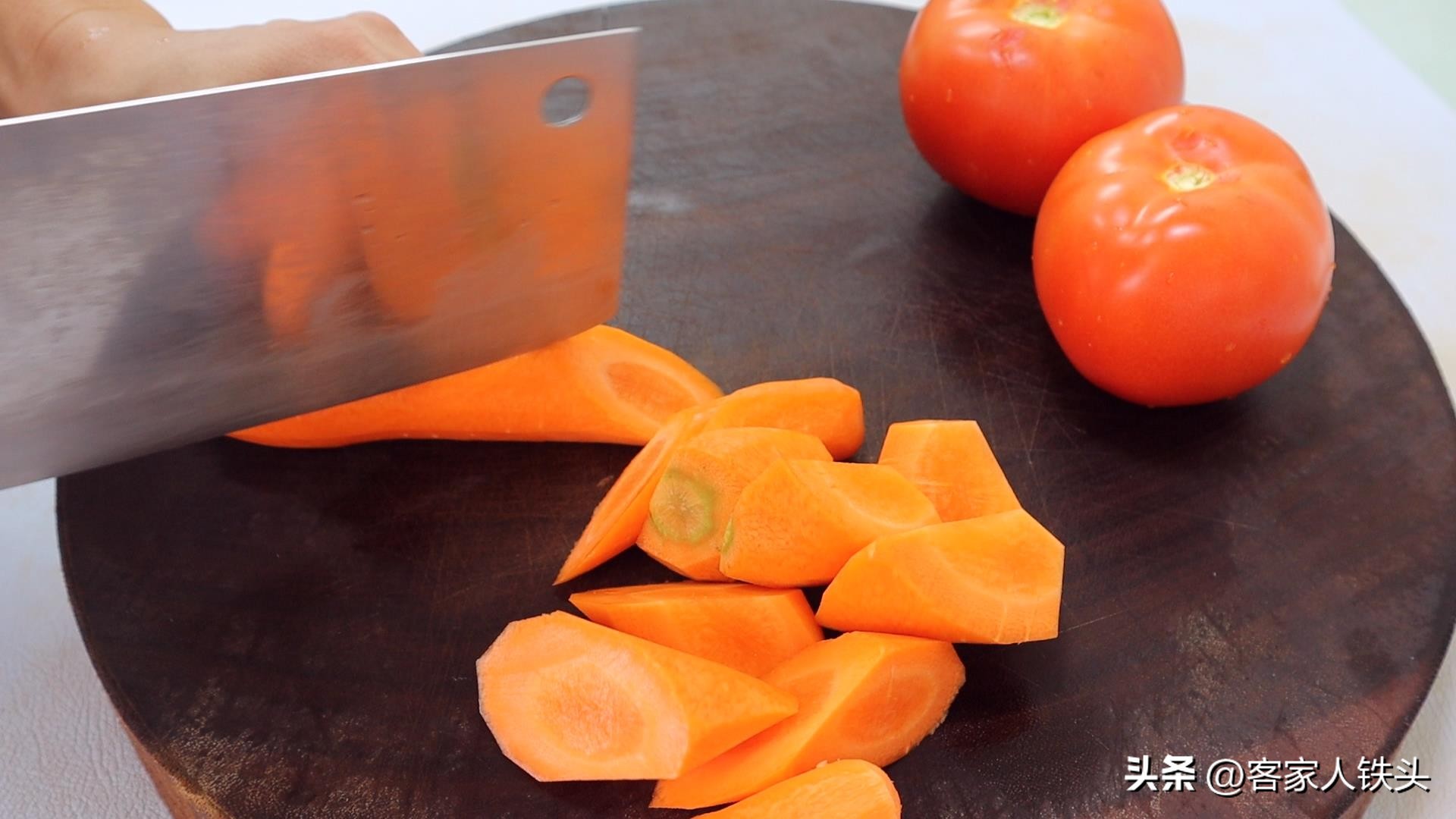 第一步:先把准备好的两个番茄和1根胡萝卜清洗干净,不喜欢吃皮的朋友也可以把它们的皮去掉,然后再把它们切块,可以稍微大块一点点,很多人不喜欢番茄皮,想要把番茄皮去掉的话,可以在番茄表面轻轻划两刀,再用开水烫1分钟,就很好去皮了。