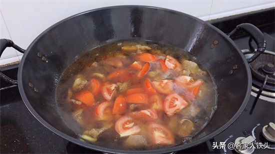 第六步:牛腩炒香后,往里面加入两勺的生抽,再加一丢丢的老抽调个色不用太多,先把它翻炒均匀,酱香味炒出来后,我们再往里面加入开水,大家记住一定要加开水哦,水量过面就行,再把我们准备好的番茄倒进去,做这道菜我喜欢把番茄煮到看都看不到来,那样汁水才非常的好吃,把锅盖盖上,用大火烧开后,再转中小火焖煮一个小时。