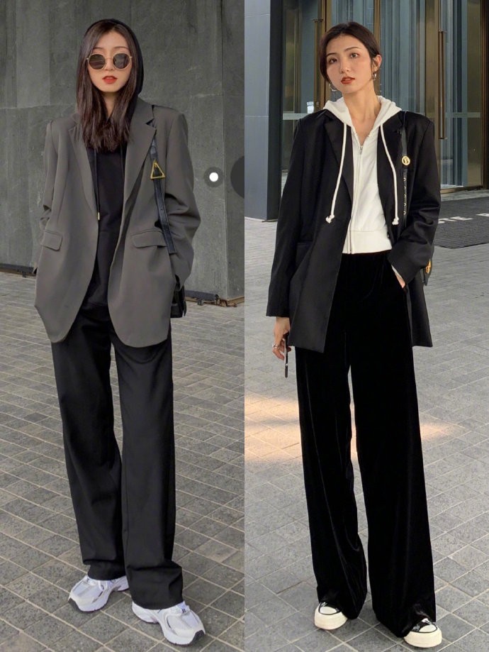西装与阔腿裤的搭配,尤其阔腿裤的材质,垂度较好的面料,穿搭后干净利落,一点也不臃肿。