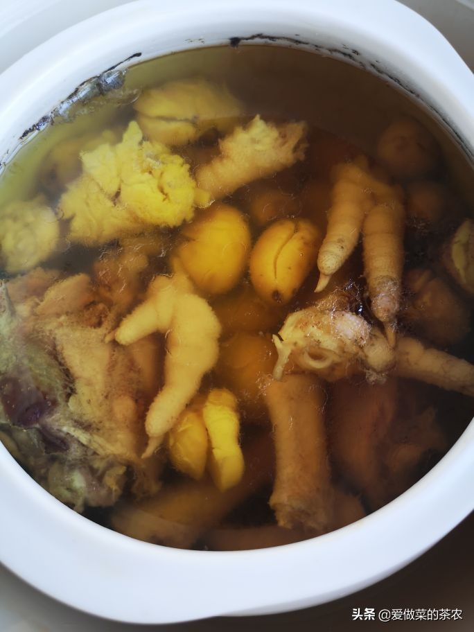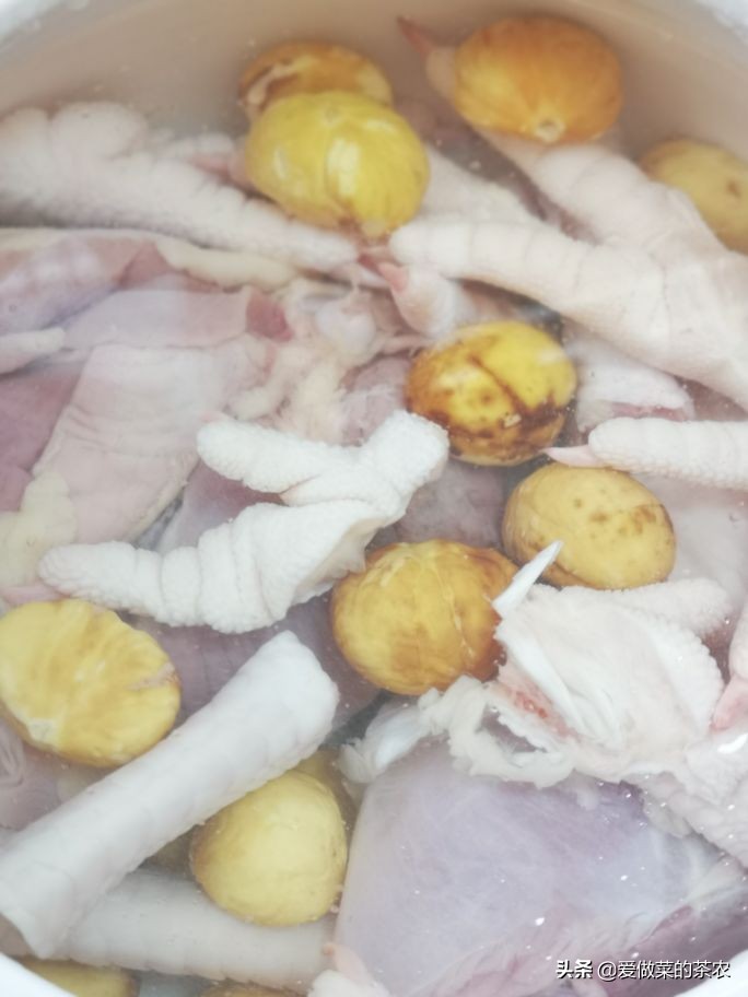 剔除鸡腿腥味的来源以后,把鸡脚斩成小块,然后直接把鸡腿、鸡脚和板栗一起放入炖盅,加冷水盖过食材少许,就可以放到炖锅里面隔水炖煮了。
