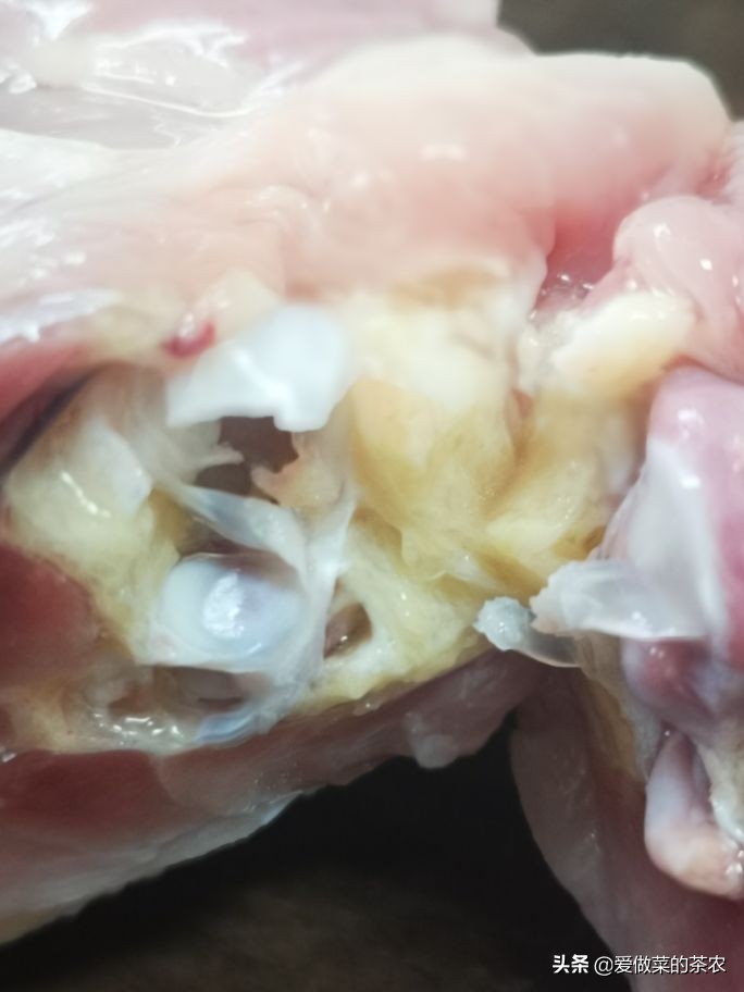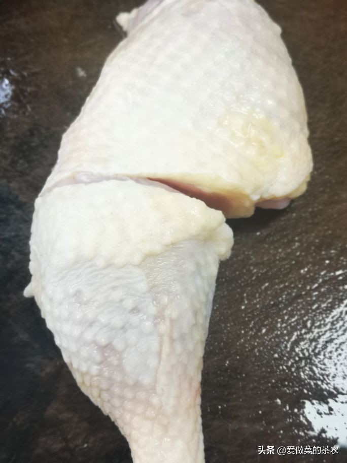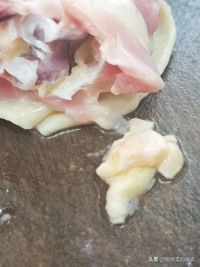 注意:鸡腿关节处,有一块黄色的油状物,非常腥,要将其剔除。