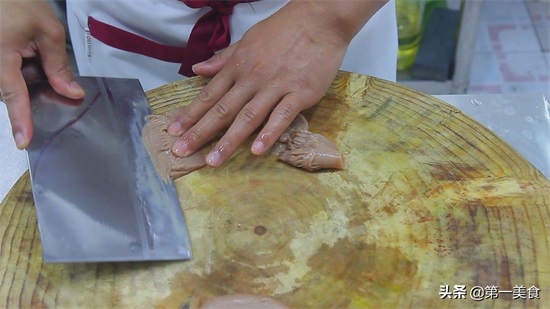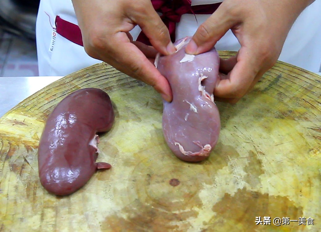 从中间切开,白色的筋膜属于腰骚,有很重的腥骚味,一定要去除干净。