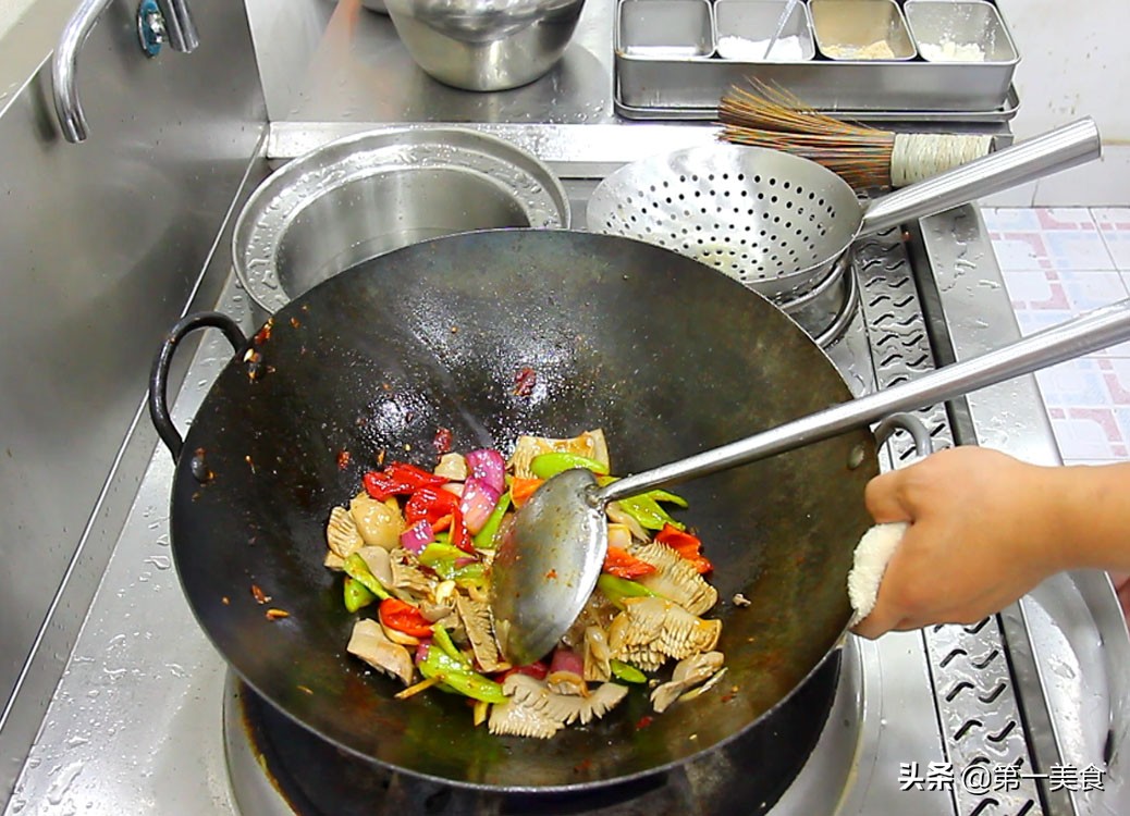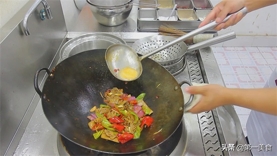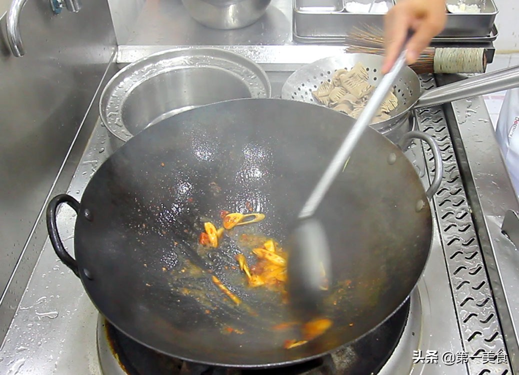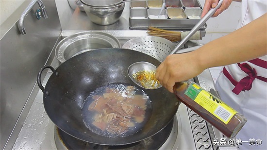 加入料酒,减少腥骚味,加入生抽,提升鲜味,加入老抽,上底色,再加入一勺食盐,一勺鸡粉,一勺白糖,翻炒化开调料。