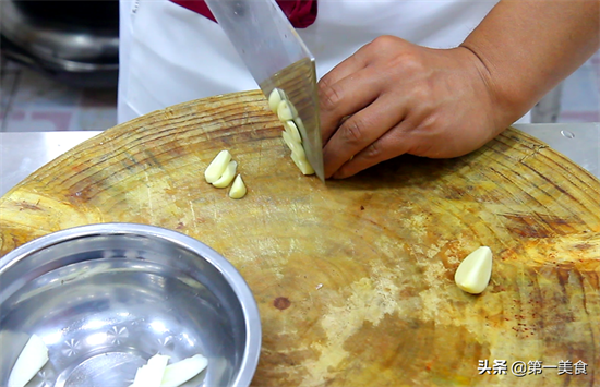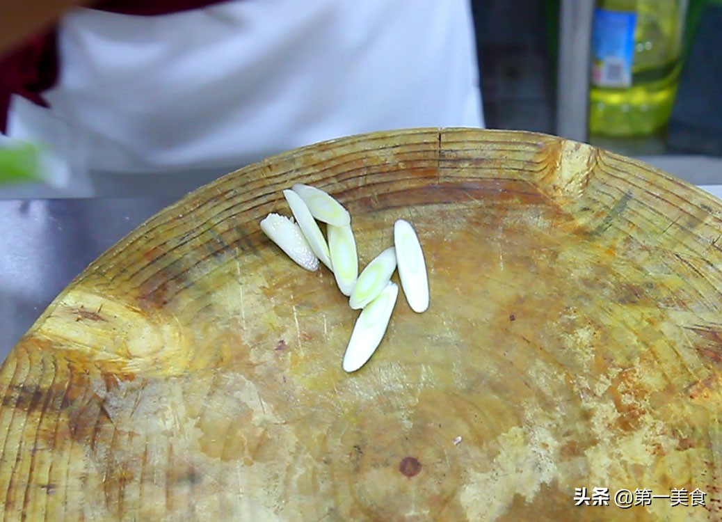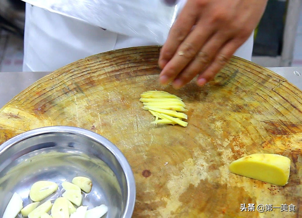 准备生姜三片,切成小细条和大蒜、葱放在一起备用。