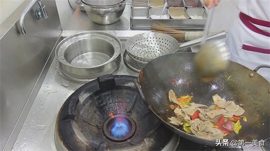然后倒入青、红椒、洋葱,继续翻炒,开大火,炒出香味以后,加入焯过水的腰花。