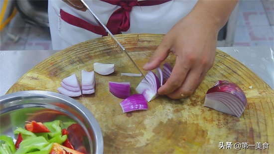 准备洋葱半个,切成菱形片和青、红椒放在一起。