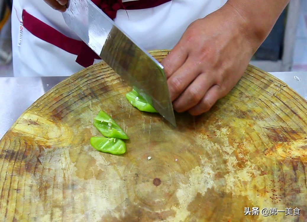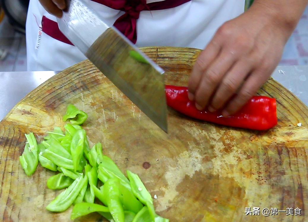 准备青椒两个,切开去除籽后,切成菱形片备用。