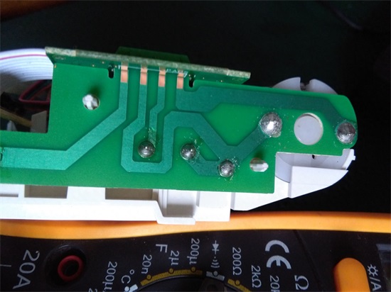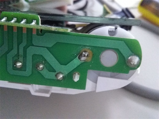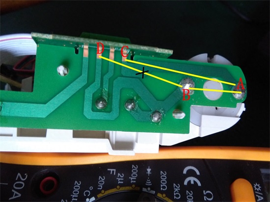 可能是由于撞击,B点的铜皮被摔虚了,重新刮下一小块绝缘漆,上锡。测试后一切正常。