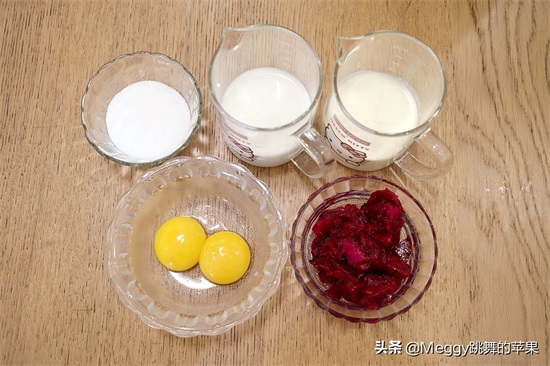 【材料】 火龙果130克,淡奶油150克,牛奶150克,细砂糖30克,鸡蛋黄2个