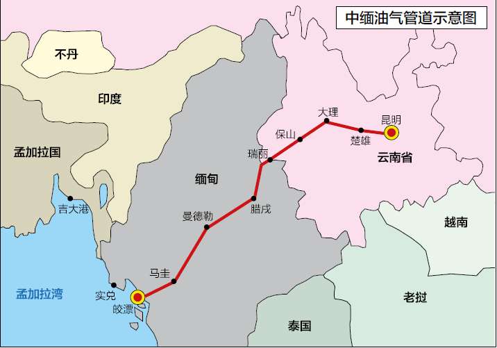 中缅油气管道南起缅甸西海岸的皎漂港,经瑞丽进入我国,是我国继中亚油气管道、中俄原油管道、海上通道之后的第四大能源进口通道。包括原油管道和天然气管道,可以使原油运输不经过马六甲海峡,而从西南地区直接输送至我国昆明。中缅油气管道有利于我国能源供应多元化,缓解我国能源对海运的依赖程度,有效保障我国能源安全。