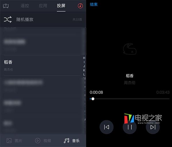 3、选择[投影]则可将手机中的图片、视频、音乐在微鲸65U电视上播放(如:播放周杰伦的《稻香》)
