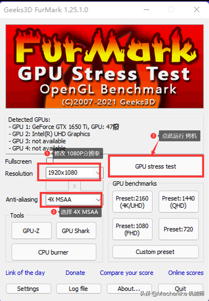 应用保存后在电脑上下载一个Furmark进行一个烤机,建议分辨率设置为1920*1080,Anti alising设置为4X。