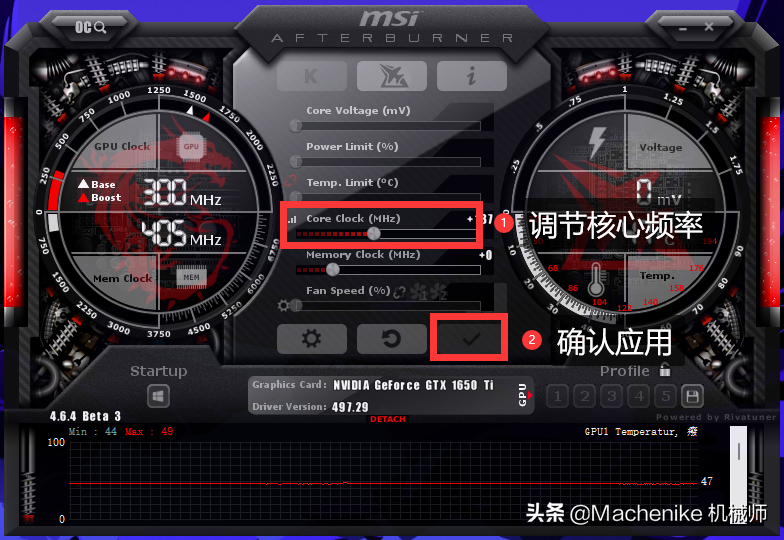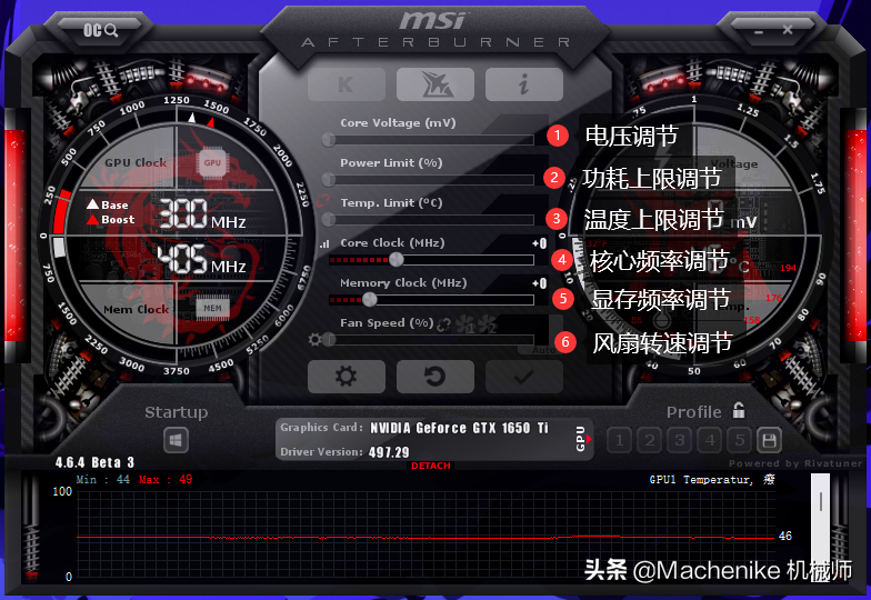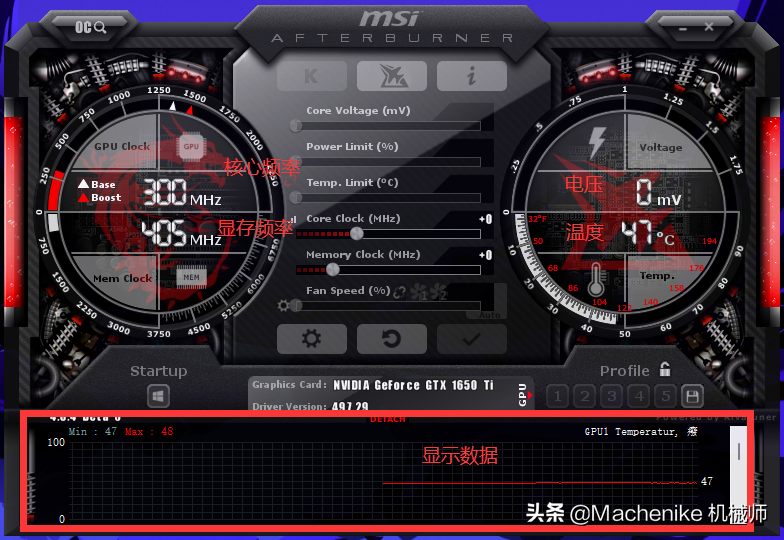而在初始界面下也可以看到,左侧显示 实时的显卡核心频率以及显存频率,右侧显示电压及显卡温度。