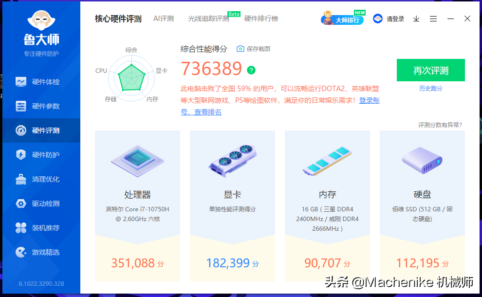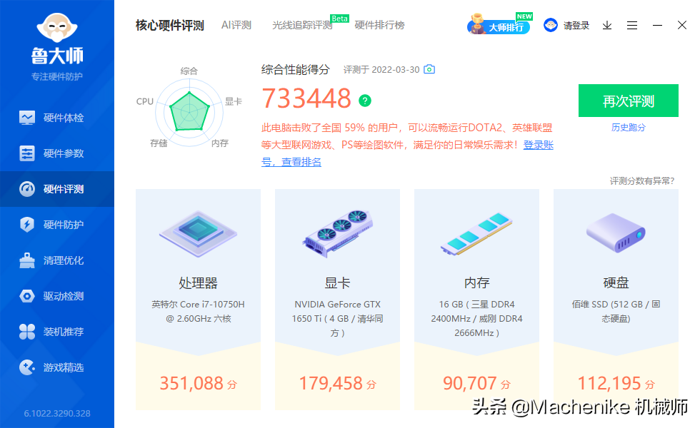 在单烤GPU中整体保持比较稳定的状态,没有高温而掉电死机蓝屏等情况,所以我们下载一个鲁大师做超频后的一个对比,超频前显卡为179458 分