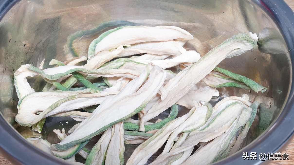 第六步:萝卜干泡好后就是下面图片中的这个状态,看起来非常的膨胀,萝卜干晒的过程中难免上面会沾上一些灰尘,泡好后把这个萝卜干多清洗一下,最后再用温开水冲洗一遍放入盘中备用。