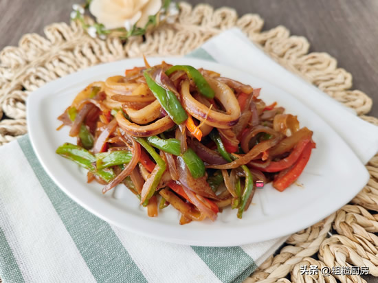 4、 绕着锅边淋入2小勺清水,开小火翻炒使食材的味道充分融合,再把准备好的青红椒丝倒入锅中,所有食材炒熟即可。