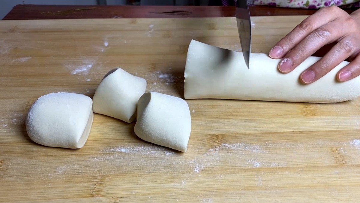 4、气体排完后搓成长条,再分成大小相等的面剂子,面剂子我们尽量切得均匀一些,这样做出来的馒头大小一致,接着取一个面剂出来,整理一下。我们要像这样由外向内地推揉整理,多揉几次,然后翻过来把面积搓圆,搓成一个小馒头的形状。这样一个生胚就做好了,把所有的小剂子都整理成这样的生坯,