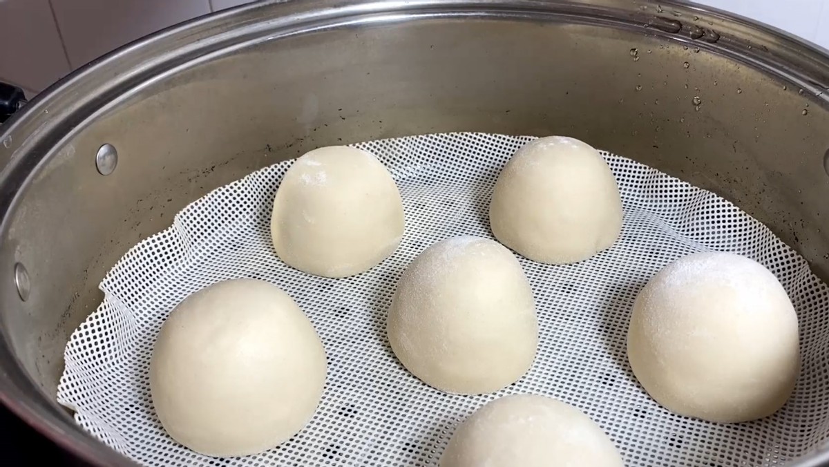 5、所有的馒头生坯全部做好了,一个个放入锅中,盖上盖子,直接开大火,上汽之后再蒸15分钟。15分钟后关火,但是不要着急开盖,先焖五分钟,再开盖,这样防止遇冷收缩,如果直接开盖我们的馒头就会遇冷回缩,馒头就不暄软了,这个就是馒头回缩的原因,这点很重要,我们不能省,5分钟后立即打开盖子,